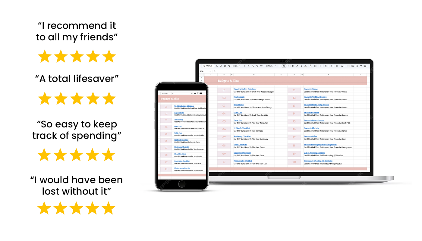 Say goodbye to self-doubt, tears and wedding chaos and say hello to a totally done-for-you spreadsheet that leaves nothing to chance.